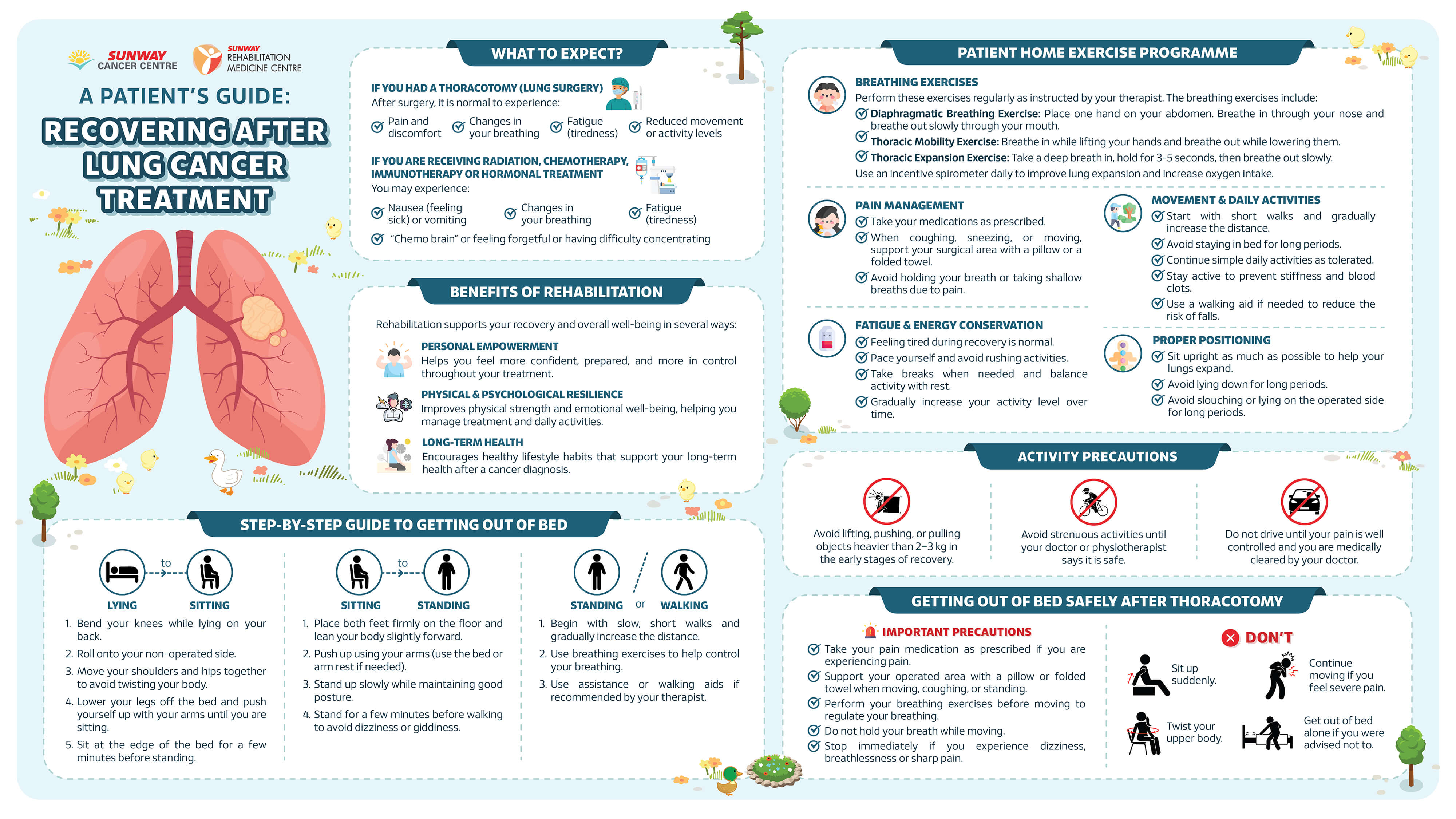 Panduan ini disediakan untuk membantu anda melalui setiap peringkat proses pemulihan. Ia merangkumi apa yang boleh dijangkakan apabila anda beralih daripada rawatan ke fasa pemulihan, cara untuk bangun dari katil dengan selamat, senaman pernafasan untuk memulihkan kekuatan dan kapasiti paru-paru secara beransur-ansur, tip praktikal untuk pemulihan di rumah, serta langkah berjaga-jaga penting yang perlu diambil sepanjang proses penyembuhan.